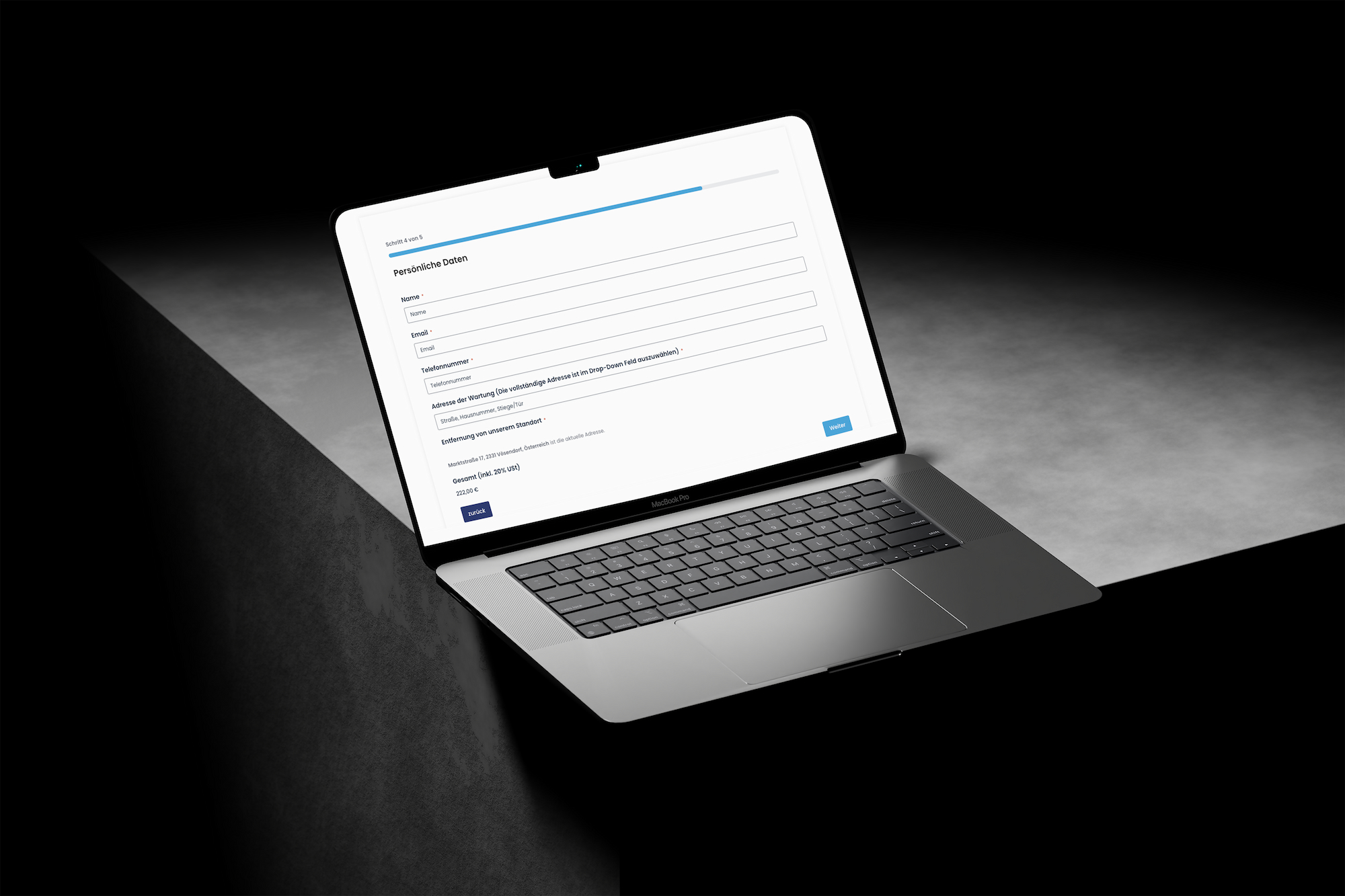 Zusätzlich wurde eine Online-Lösung für die Wartungsbuchung aufgebaut, über die Bestandskunden Termine selbstständig vereinbaren können – inklusive automatischer Preisanpassung je nach Standort. Der Preis wird dabei anhand des eingegebenen Bezirks oder der PLZ dynamisch berechnet, sodass Fahrtkosten und Anfahrtsaufwand transparent und fair abgebildet werden.